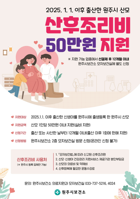 원주시는 2025년부터 출산 또는 사산한 산모의 산후 회복을 돕고 경제적 부담을 줄이기 위해 산후조리비를 지원하는 사업을 시행하고 있다.