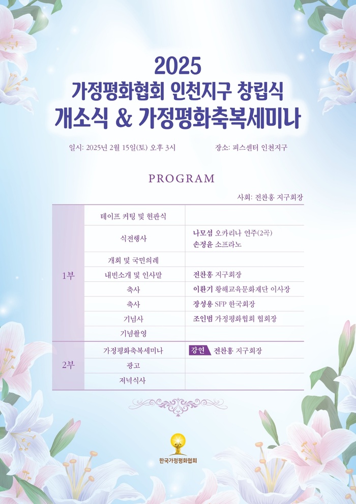 오는 2025년 2월 15일(토) 오후 3시, 퍼스센터 인천지구에서 ‘2025 가정평화협회 인천지구 창립식 및 가정평화축복세미나’가 열린다. 이번 행사는 가정의 화합과 평화를 도모하는 목적으로 개최되며, 각계 주요 인사들이 참석할 예정이다.