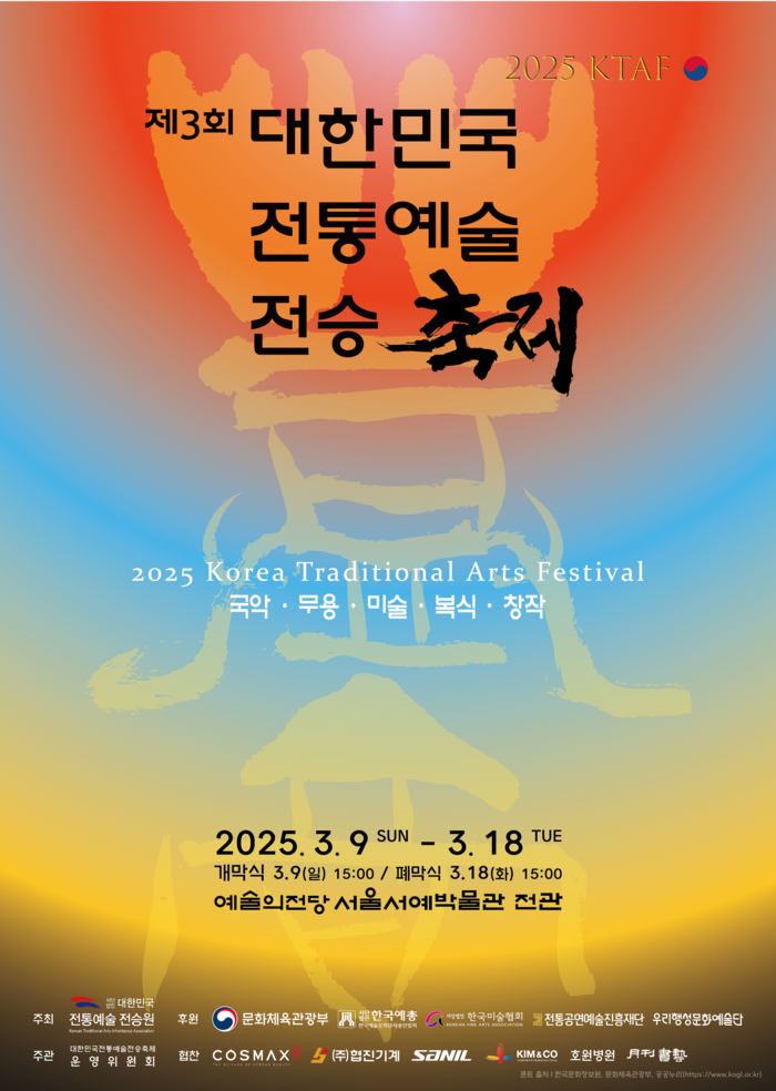 ![]() [코리안투데이] ‘제3회 대한민국 전통예술 전승축제’ 포스터. 자료=대한민국전통예술전승원 |