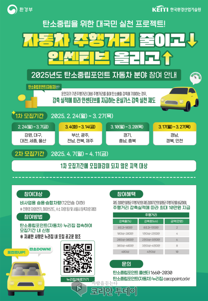 ![]() [코리안투데이] 자동차 탄소중립포인트제 참여자 모집 © 이윤주 기자 |