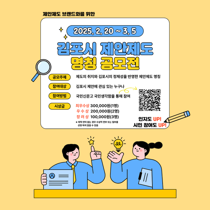 김포시 관계자는 “이번 공모전을 통해 김포시 제안제도의 인지도가 높아지고, 시민들의 참여가 활성화되기를 기대한다”고 밝혔다.