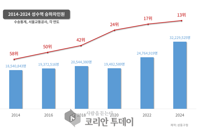 서울교통공사의 ‘서울 지하철 1~8호선 수송 통계’에 따르면, 성수역은 2014년 50위권(58위)에서 2018년 40위권(42위), 2020년 20위권(24위)에 진입하며 꾸준히 순위를 높였다. 이후 2021년 19위, 2022년 17위, 2023년 15위를 기록하며 매년 2단계씩 상승, 2024년에는 13위를 차지했다.