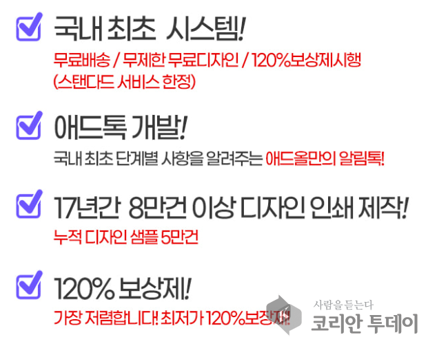 경기 불황이 길어지면서 자영업자들은 홍보 비용 절감에 더욱 신경 쓰고 있다. 효과적인 광고 수단으로 여전히 전단지, 명함, 스티커 등의 인쇄물이 널리 활용되지만, 디자인 비용과 제작비 부담이 만만치 않다. 이런 상황에서 인쇄 전문 업체 **‘애드올’**이 내놓은 ‘최저가 보장 + 120% 보상’ 정책이 많은 관심을 받고 있다. 만약 타 업체보다 비싸다면 차액의 120%를 보상하는 파격적인 조건을 내세운 것이다.