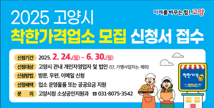 신청을 원하는 업소는 착한가격업소 지정 신청서를 작성해 방문, 우편 또는 이메일로 제출하면 된다. 세부 사항은 고양특례시청 누리집(고시·공고) 또는 소상공인지원과(☎031-8075-3542)를 통해 확인할 수 있다.