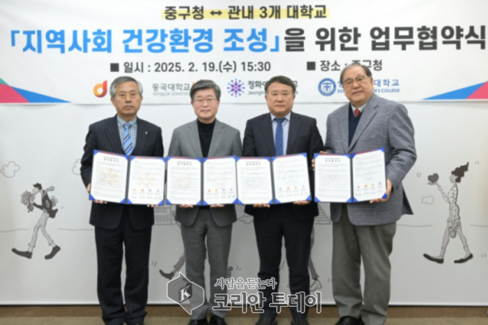 ![]() [코리안투데이] 서울 중구, 지역 3개 대학과 ‘건강환경 조성’ 업무협약 체결 © 지승주 기자 |