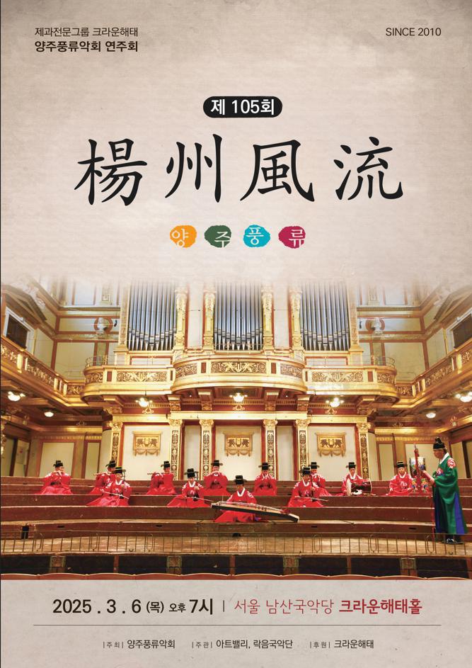 제105회를 맞이한 양주풍류악회 연주회가 2025년 3월 6일(목) 오후 7시, 서울 남산국악당 크라운해태홀에서 개최된다. 양주풍류악회는 전통 궁중음악을 보존·계승하는 단체로, 이번 공연을 통해 격조 높은 궁중음악의 정수를 선보일 예정이다.