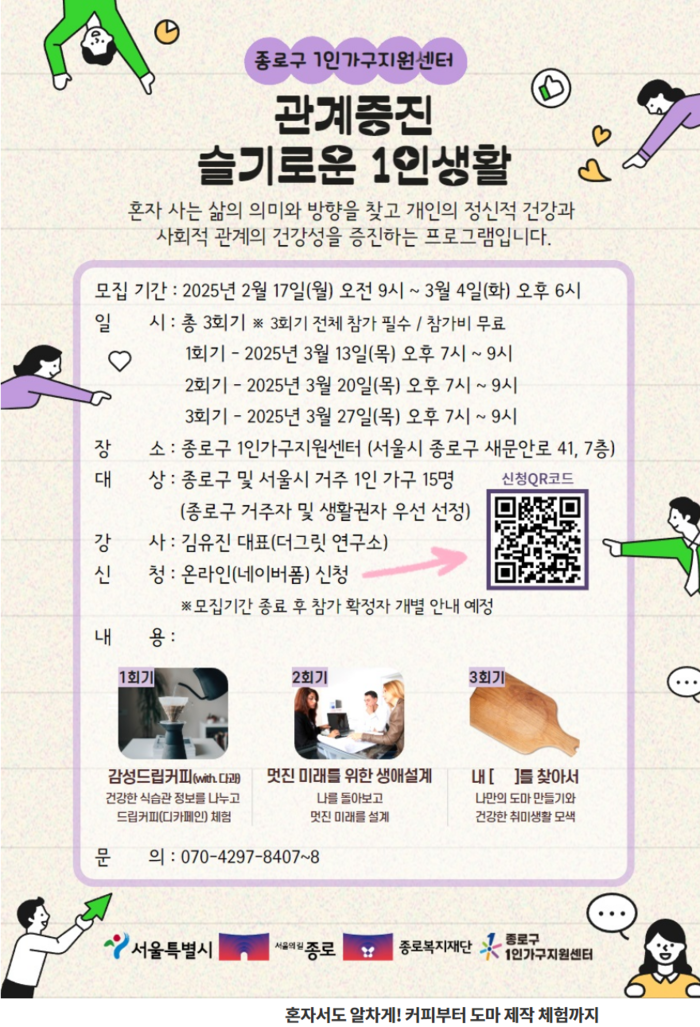 참여 대상은 종로구 및 서울시에 거주하는 1인 가구 15명이며, 종로구민과 생활권자가 우선 선정된다. 신청은 3월 4일까지 서울시 1인 가구 지원 포털 ‘씽글벙글서울’을 통해 가능하다.