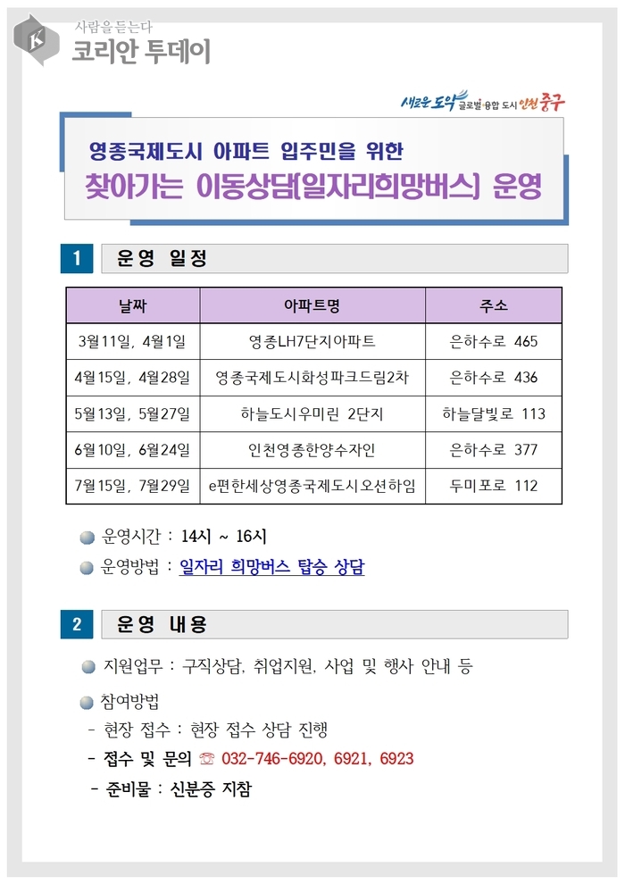 올해 일자리 희망버스는 3월부터 매월 둘째·넷째 주 화요일 오후 2시부터 4시까지 영종국제도시 내 아파트 단지를 순회하며 운영된다. 첫 번째 행사는 오는 11일 영종7단지엘에이치 아파트 관리사무소 앞에서 열릴 예정이다.
