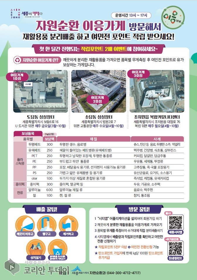 도담동 1호점은 3월부터 10월까지 매주 금요일 운영되며, 2호점 소담동과 3호점 조치원 이응가게는 4월부터 각각 수요일과 월요일에 문을 연다. 이를 통해 시민들의 접근성을 높이고, 보다 많은 주민이 재활용 활동에 참여할 수 있도록 유도할 계획이다.