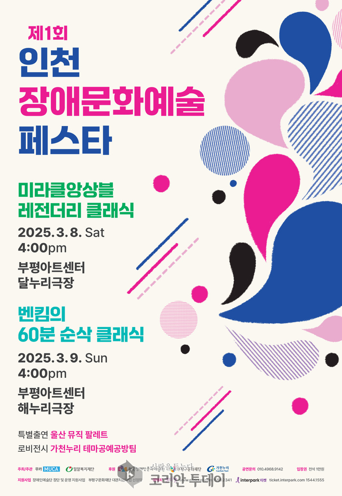 ‘제1회 인천 장애문화예술페스타’는 단순한 공연을 넘어 장애예술의 미래를 함께 만들어 가는 중요한 출발점이 될 것으로 보인다. 장애예술의 아름다움을 함께 나누고 응원하고 싶은 이들에게 특별한 시간이 될 이번 페스타는 전석 1만 원으로, 엔티켓(www.enticket.com, ☎1588-2341)에서 예매 가능하며, 현장 구매도 가능하다.
