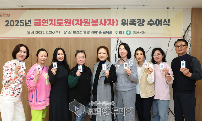 지난 2월 24일 강남구보건소에서 열린 금연지도원 위촉식에는 박다미 강남구의회 의원, 이종철 강남구보건소장을 비롯한 관계자 및 신규 자원봉사자들이 참석해 금연문화 정착을 위한 의지를 다졌다.