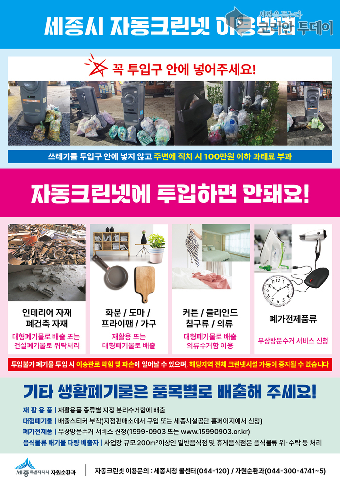 세종특별자치시는 오는 17일부터 28일까지 공동주택 및 상업시설 자동크린넷 상습 막힘 지역을 대상으로 생활폐기물 불법 배출 단속을 시행한다. 이번 조치는 이불, 장판, 베개, 쿠션 등 대형폐기물이 자동크린넷에 무단 투입되면서 수거관로가 자주 막히는 문제를 해결하기 위한 것이다.