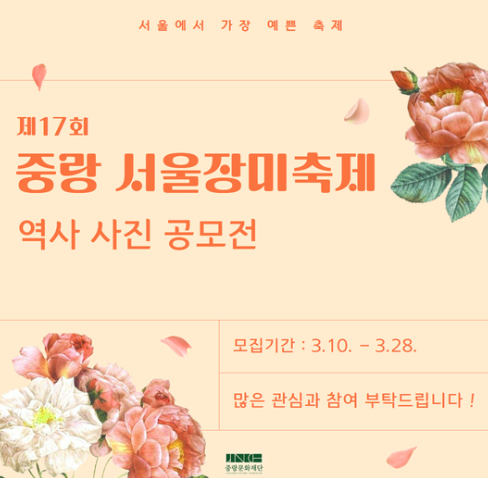 중랑구(구청장 류경기)와 중랑문화재단(이사장 조민구)이 제17회 중랑 서울장미축제를 맞아, 더욱 많은 구민이 함께 축제를 만들어 갈 수 있도록 다양한 공모전을 진행하고 있다. 이번 공모전은 퍼레이드부터 전시, 친환경 마켓까지 다채로운 분야에서 모집이 이루어져 구민들의 적극적인 참여를 유도할 예정이다.
