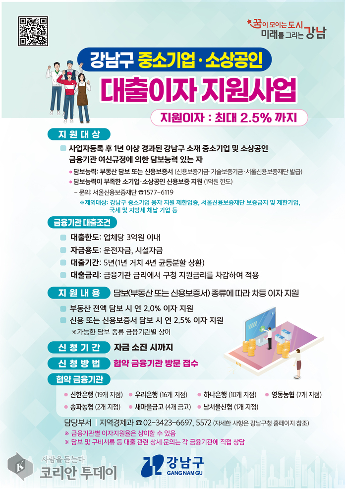 ![]() [코리안투데이] 2025 강남구 시중은행 대출이자 지원사업 모집 포스터 © 최순덕 기자 |
