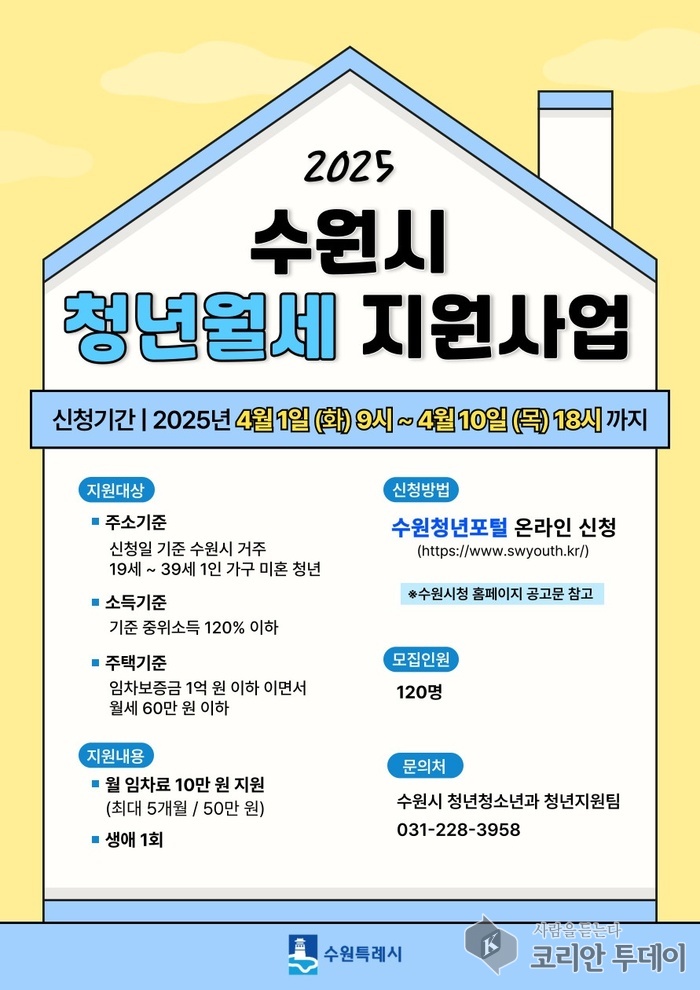수원시는 ‘2025년 수원시 청년 월세 지원사업’에 참여할 청년 120명을 4월 1일부터 10일까지 모집한다.