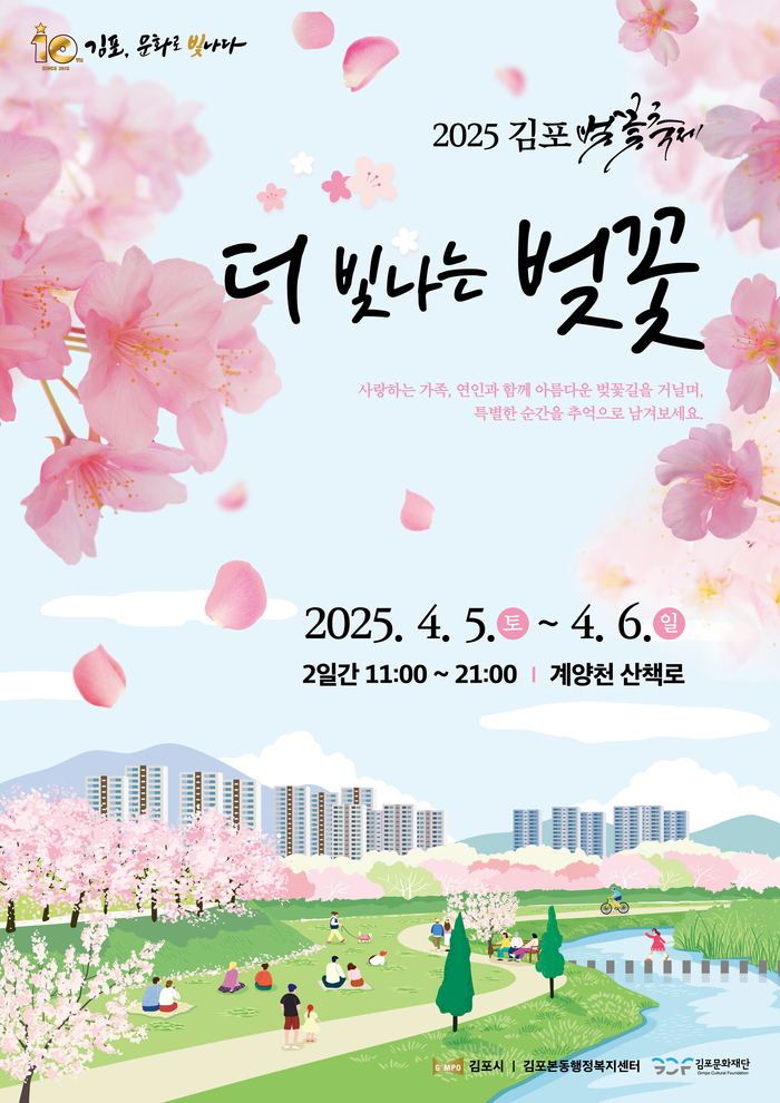 김포시(시장 김병수)는 오는 4월 5일(토)부터 6일(일)까지 이틀간 김포의 대표적인 벚꽃 명소인 계양천 산책로 일원에서 ‘2025 김포 벚꽃축제’를 개최한다고 밝혔다.