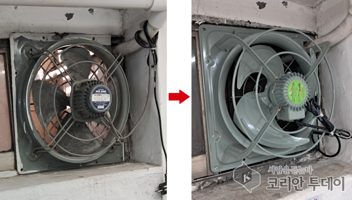 ![]() [코리안투데이] 의류 제조업체 창호 환풍기 교체 전, 후(사진제공: 동대문구청) ⓒ 박찬두 기자 |