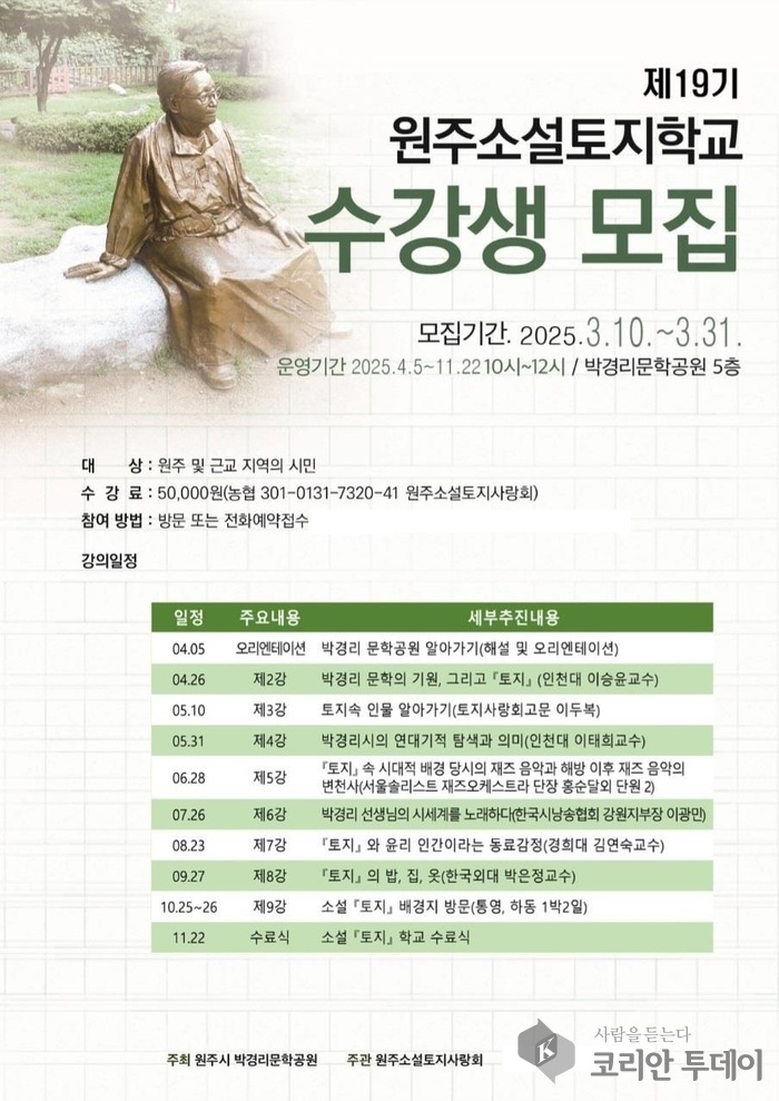 매년 수강생들의 높은 만족도를 자랑하는 원주소설토지학교는 박경리 작가의 작품을 사랑하는 이들에게 깊이 있는 문학적 경험을 제공한다. 모집 기간은 3월 10일부터 31일까지이며, 자세한 사항은 원주소설토지사랑회로 문의하면 된다.