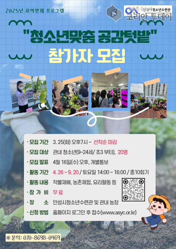 안성시청소년수련관이 청소년을 위한 ‘청소년맞춤 공감텃밭’ 프로그램 참가자를 3월 25일부터 선착순 모집한다.