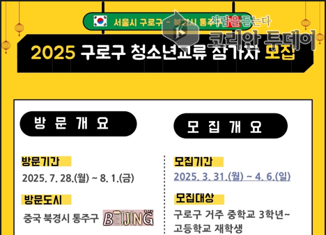 ![]() [코리안투데이] 사진 구로구 언론팀 제공 구로구-통주구 청소년 교류 프로그램 모집 안내문 © 박수진 기자 |