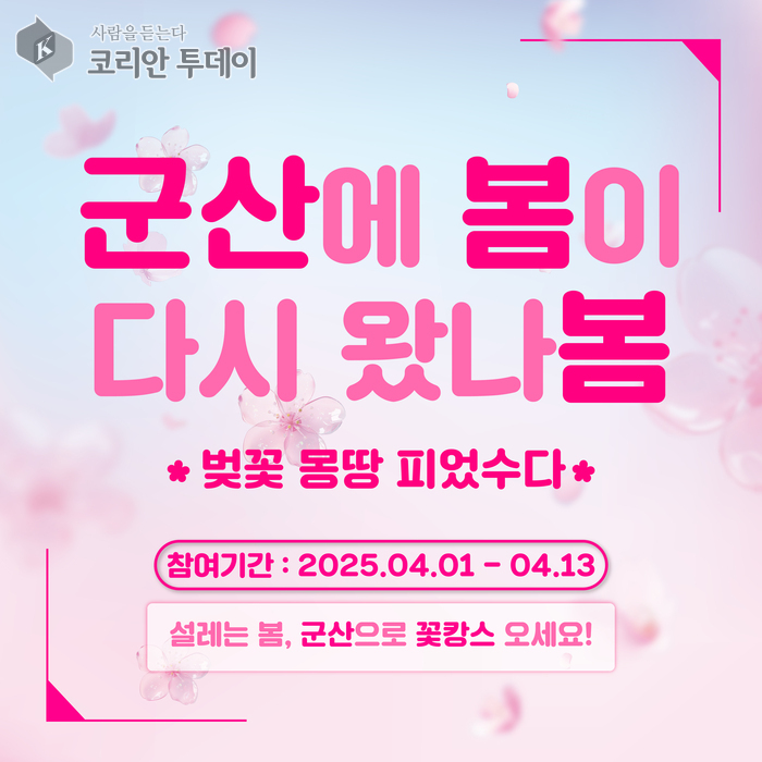 군산에서 봄바람 휘날리며 꽃캉스를 즐기고 싶은 이들에게 이번 이벤트는 놓칠 수 없는 기회다. 벚꽃이 만개한 지금, 스마트폰 하나만 챙기고 군산의 봄을 담으러 떠나보자.