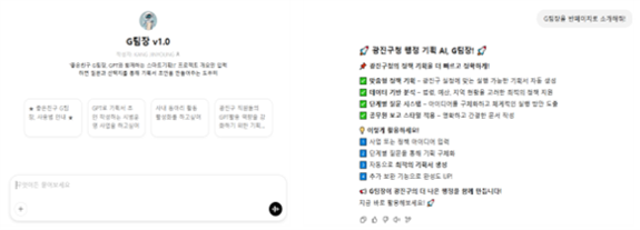 광진구청장은 “G팀장은 광진구 스마트 행정 역량강화를 위한 핵심 도구”라며 “이번 시범운영을 통해 기획업무를 효율적으로 지원하고, 인공지능 기술의 행정 적용 가능성을 실험하는 기회가 될 것”이라고 밝혔다.