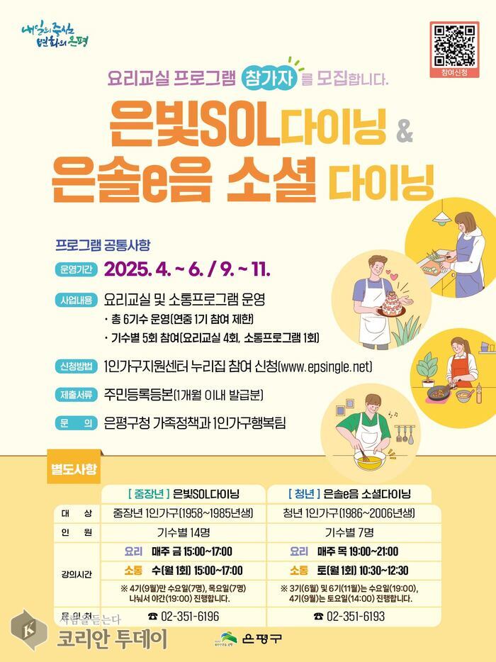 ‘은빛SOL다이닝’은 기수당 14명, ‘은솔e음 소셜다이닝’은 기수당 7명을 모집하며, 신청은 은평구 1인가구지원센터 누리집을 통해 가능하다. 한 명당 1기수에만 참여할 수 있으며 중복 신청은 제한된다.