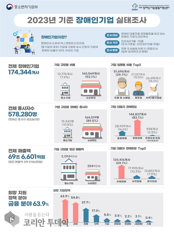 ![]() [코리안 투데이] 2023년 기준 장애인기업 실태조사‘ 내용.ⓒ중소벤처기업부 © 두정희 기자 |