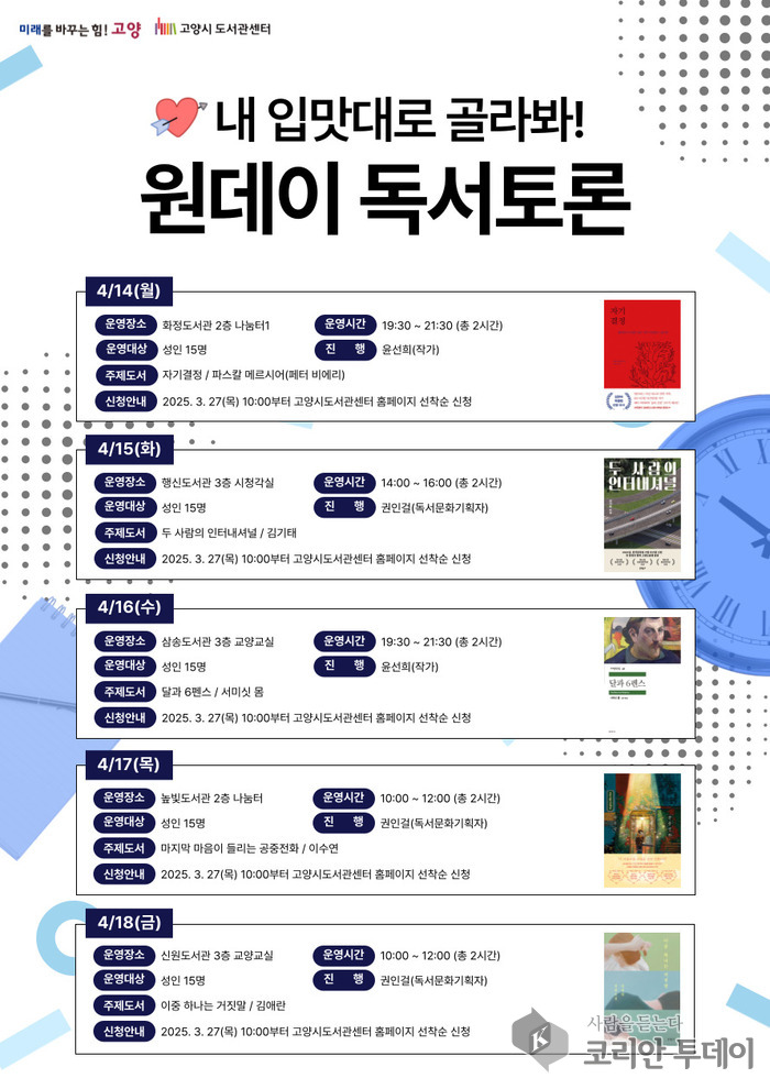 덕양구, 일산동구, 일산서구 등 3개 구에서는 각기 다른 테마의 독서 프로그램이 열린다. 덕양구 5개 도서관에서는 4월 4일부터 ‘내 입맛대로 골라봐! 원데이 독서토론’을 시작으로 작가와 함께하는 심층 독서토론을 진행한다. 어린이를 위한 한글-영어 동시 읽기 프로그램도 함께 마련됐다.