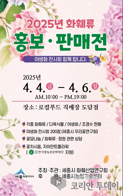 세종시 화훼산업연구회가 꽃 소비문화 확산과 화훼농가 판로 확대를 위해 ‘2025년 세종 화훼류 홍보·판매전’을 연다. 이번 행사는 4일부터 6일까지 3일간 도담동 로컬푸드 직매장 도담점에서 열린다.