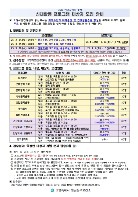 고양특례시 일산동구보건소 산하 고양시민건강센터중산이 2025년 2분기 신체활동 프로그램 참가자를 모집한다. 신청은 3월 24일부터 선착순으로 접수하며, 프로그램은 4월 1일부터 본격 운영된다.