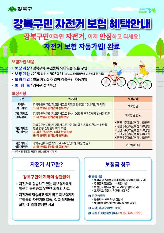 이번 자전거보험은 강북구에 주민등록이 되어 있는 구민이라면 누구나 자동으로 가입되며, 보험료는 전액 강북구에서 부담한다. 보장 기간은 2024년 4월 1일부터 2025년 3월 31일까지 1년간이다.