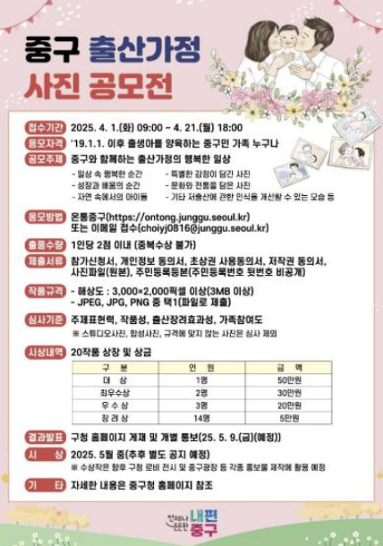 서울 중구가 출산가정을 대상으로 가족의 소중한 순간을 담은 사진 공모전을 개최한다. 2019년 이후 출생아를 양육하는 중구민이 참여할 수 있으며, 수상작은 구청 전시와 홍보물로 활용된다.