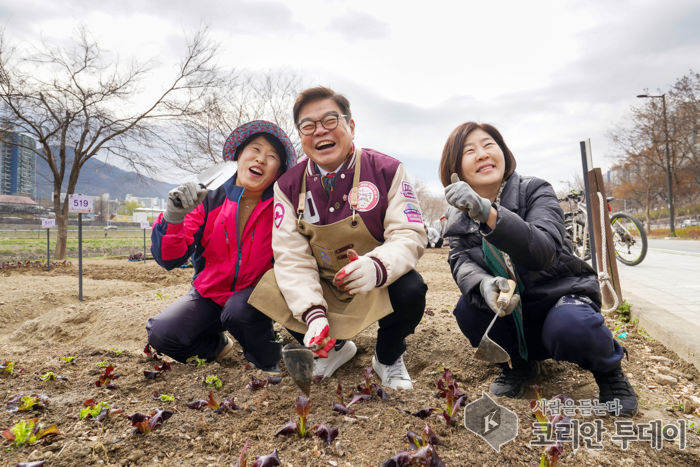 ![]() [코리안투데이] 중랑천 도시농업체험학습장을 방문한 이필형 동대문구청장이 주민과 상추 모종을 심고 있는 모습(장안2수변공원 도시농업체험장)(사진제공: 동대문구청) ⓒ 박찬두 기자 |