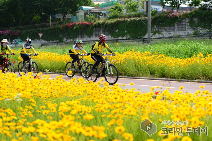 [코리안투데이중랑천변 자전거길에서 자전거 타는 시민들(사진제공동대문구청ⓒ 박찬두 기자