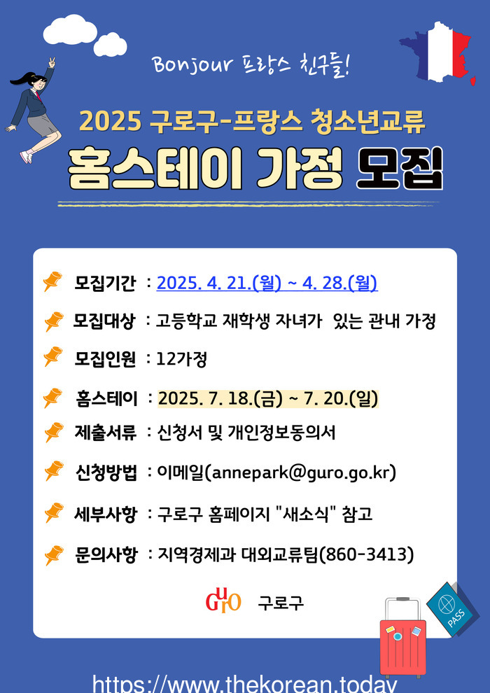 ![]() [코리안투데이] 사진 구로구 언론팀 제공 구로구-프랑스 청소년교류 홈스테이 가정 모집 홍보 안내문 © 박수진 기자 |