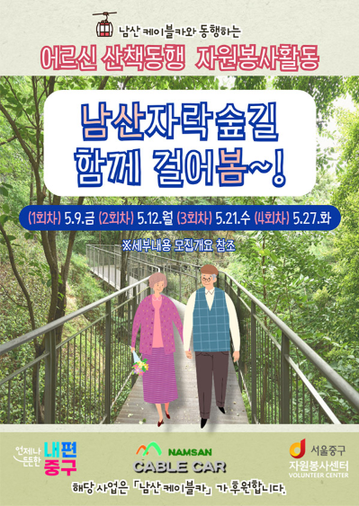 서울 중구는 오는 5월 한 달간 ‘남산자락숲길 함께 걸어봄~!’ 산책 프로그램을 운영한다고 밝혔다. 이번 프로그램은 중구 관내 어르신 약 100명을 대상으로 진행되며, 자원봉사자와 함께 남산 주변의 걷기 좋은 길을 산책하며 따뜻한 봄날의 정취를 나누는 시간으로 마련됐다.