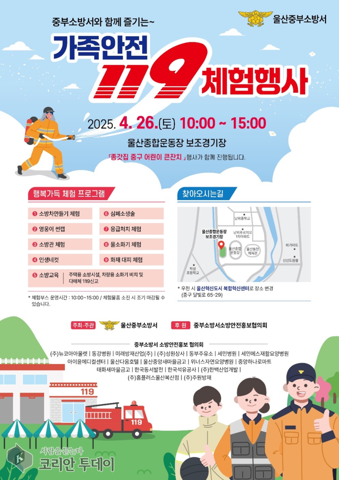울산 중부소방서는 가정의 달을 맞아 오는 4월 26일(토) 오전 10시부터 오후 3시까지 중구 남외동 종합운동장 보조경기장에서 ‘가족안전 119체험행사’를 개최한다고 밝혔다.