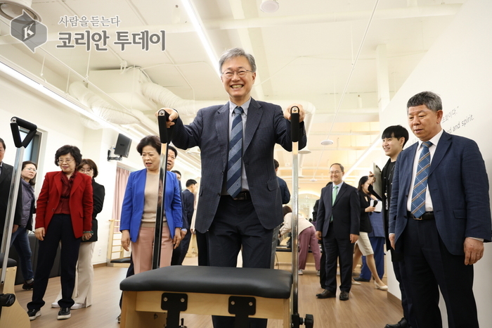 ![]() [코리안투데이] 사진 구로구 언론팀 제공 장인홍 구로구청장이 구로G밸리체육관 운동기구를 체험하고 있다. © 박수진 기자 |
