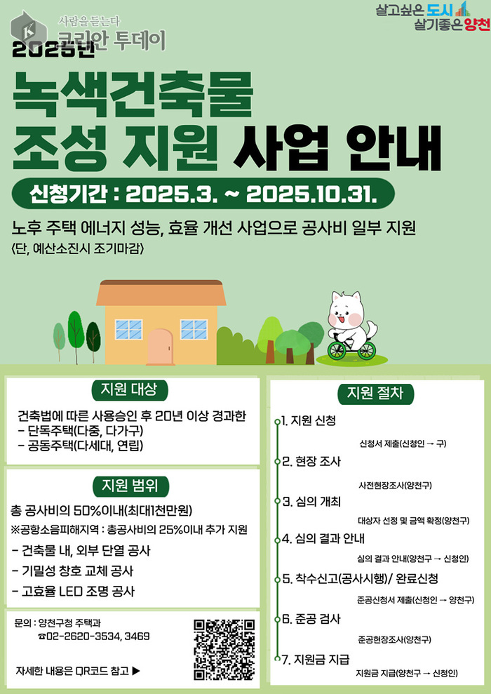 ![]() [코리안투데이] 양천구 녹색건축물 조성 지원사업 안내 포스터 © 변아롱 기자 |