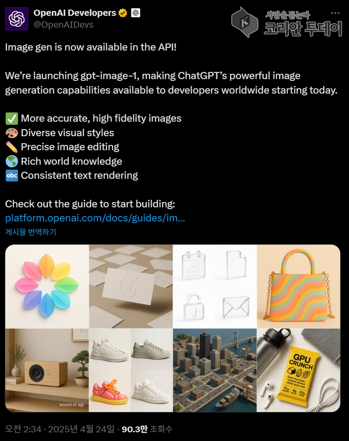 ![]() [코리안투데이] OpenAI는 지난 4월 24일 X에 이미지 생성 API를 공개하겠다고 밝혔다. © 변아롱 기자 |