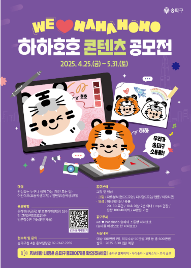 이번 공모전은 ‘하하·호호가 즐기는 송파구’를 주제로 하며, 그림과 영상 분야로 나눠 진행된다. 그림 부문은 손 그림과 디지털 드로잉 모두 가능하며, 영상 부문은 2D, 3D 애니메이션 또는 직접 촬영한 숏폼 형식으로 제작할 수 있다. 인공지능을 활용한 창작물도 제출이 가능하다.