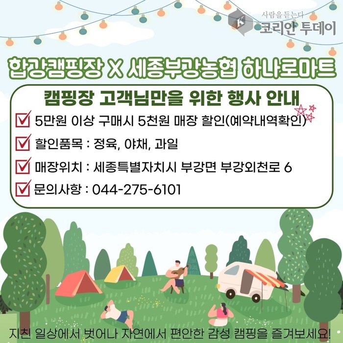 이외에도 합강캠핑장 방문객은 세종부강농협 하나로마트와의 협업을 통해 할인 혜택을 받을 수 있다. 5만 원 이상 정육·야채·과일류 구매 시 5천 원 할인이 적용되며, 이는 지역 상생모델로도 주목받고 있다. 세종시민의 여가 만족도 향상과 지역경제 활성화를 동시에 꾀하는 긍정적인 시도다.
