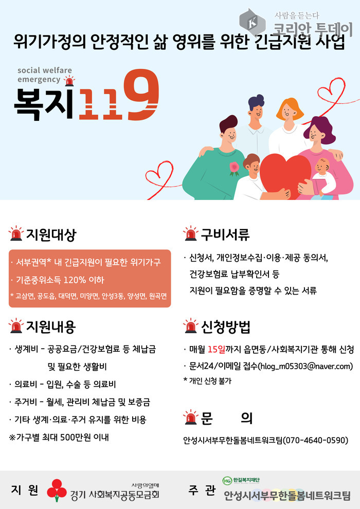 지원 대상은 고삼면, 공도읍, 대덕면, 미양면, 안성3동, 양성면, 원곡면 등 서부권역에 거주하며 기준 중위소득 120% 이하인 가구 중 갑작스런 위기상황에 처한 이들이다.