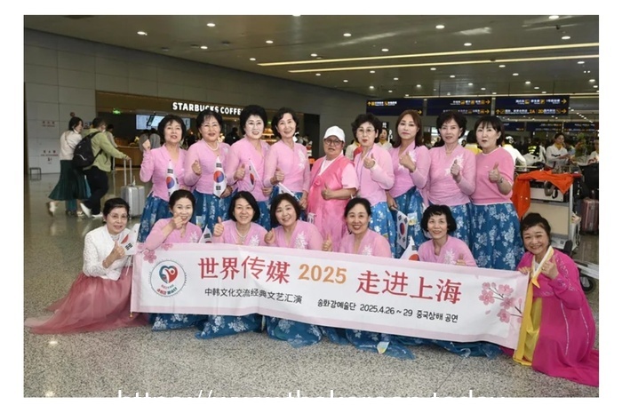 4月26日,艺术团从韩国仁川机场出发,抵达上海浦东国际机场。成员们身着传统韩服整齐亮相,手持写有“世界大舞台,有你更精彩”的红色横幅,在机场拍摄的集体照,成为此次文化交流的重要象征,展现了韩国艺术的品格与团员的热忱。
