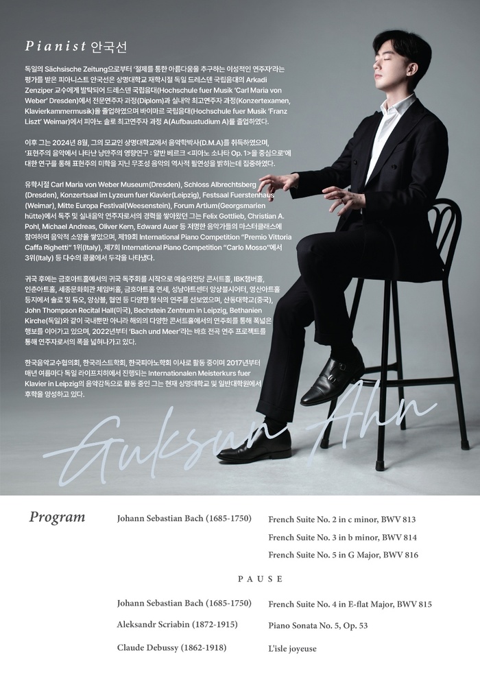 이번 독주회는 바흐의 프랑스 모음곡 전곡 시리즈 중 2번, 3번, 5번, 4번을 중심으로, 러시아 후기 낭만주의를 대표하는 스크리아빈의 피아노 소나타 5번(Op.53), 프랑스 인상주의의 거장 드뷔시의 ‘기쁨의 섬(L’isle joyeuse)’까지 시대를 초월한 다양한 레퍼토리로 구성되어 있다. 고전에서 낭만, 그리고 현대 감성까지 아우르는 음악 여정으로 관객에게 깊은 감동을 선사할 예정이다.