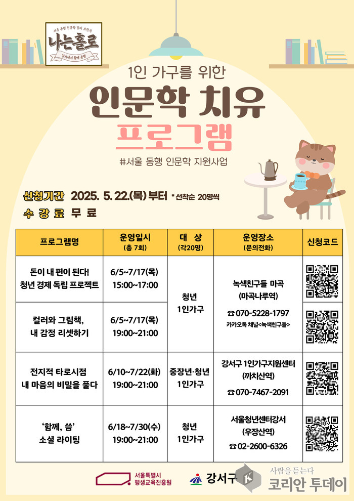 대상은 1인 가구 청년 및 중장년층, 자립 준비 중인 청년이며, 프로그램별 선착순 20명을 모집한다. 신청은 5월 22일부터 강서구청 누리집의 공지사항 내 QR코드를 통해 가능하다.