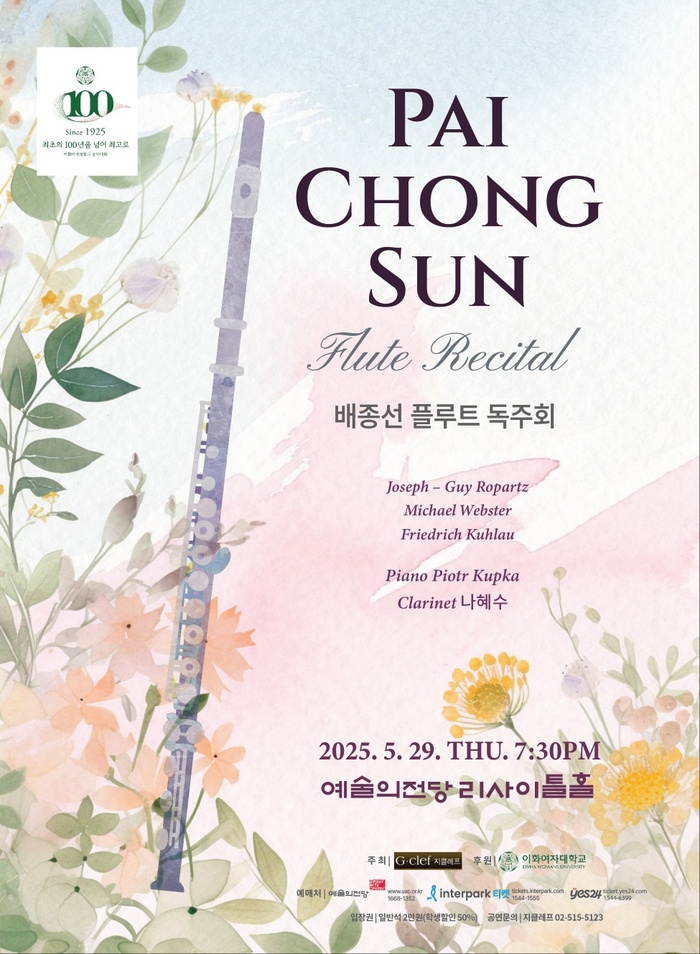 국내외에서 활발한 연주 활동을 이어온 플루티스트 배종선의 독주회가 2025년 5월 29일(목) 오후 7시 30분, 서울 예술의전당 리사이틀홀에서 열린다. 이번 무대는 G-clef 기획과 이화여자대학교의 후원으로 진행되며, 정통 클래식 레퍼토리와 섬세한 감성의 연주가 어우러지는 무대로 클래식 팬들의 기대를 모으고 있다.