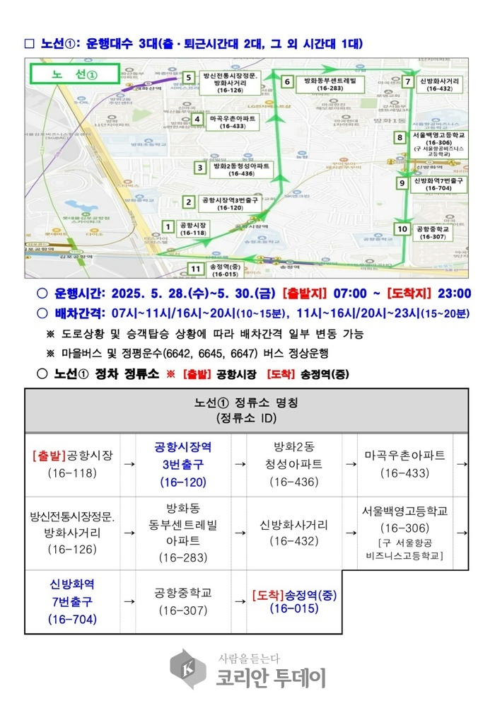 첫 번째 임시 노선은 공항시장을 출발해 공항시장역(3번 출구), 신방화역(7번 출구), 송정역을 거치는 노선이며, 45인승 전세버스 3대가 투입되어 순환 운행된다. 두 번째 노선은 등촌중학교에서 출발해 등촌역(7번 출구), 까치산역(2번 출구), 화곡역(4번 출구)을 거쳐 강서구청에 도착하는 노선으로, 전세버스 7대가 배치됐다. 아울러 구청 관용 차량 2대도 예비차량으로 대기 중이다.