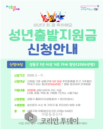 서울 성동구(구청장 정원오)는 성년의 날을 맞아 사회로 첫발을 내딛는 19세 청년들을 위한 실질적인 지원책인 ‘성년출발지원금’ 사업을 본격 추진 중이라고 27일 밝혔다.